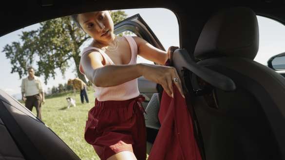 يمكن تثبيت علاقة الملابس في الحامل الأساسي أو ضمن التجهيزات الاختيارية "Travel & Comfort"، ويمكن أيضاً استخدامها خارج السيارة.