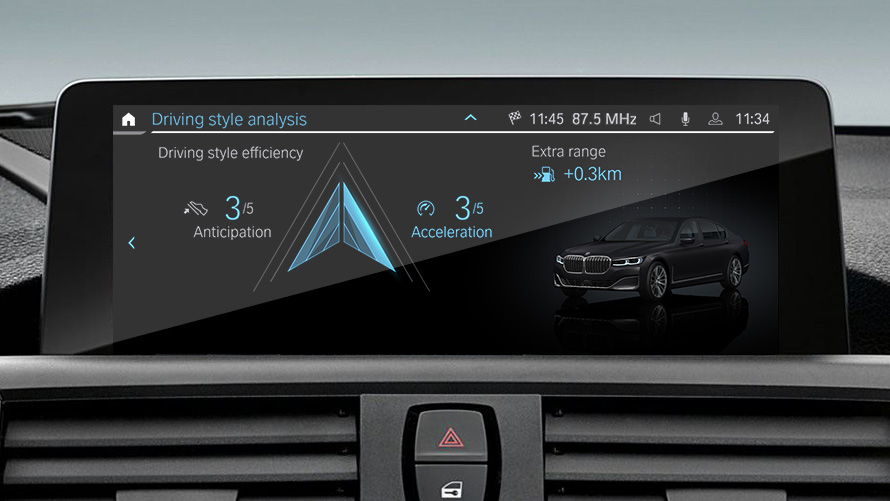 The driving style analysis function helps by providing tips based on the specific situation for developing a more efficient driving style and saving fuel. During the process, driving style is analysed and evaluated in various categories. The evaluation and accompanying tips are shown in the Control Display in the ECO PRO driving mode.