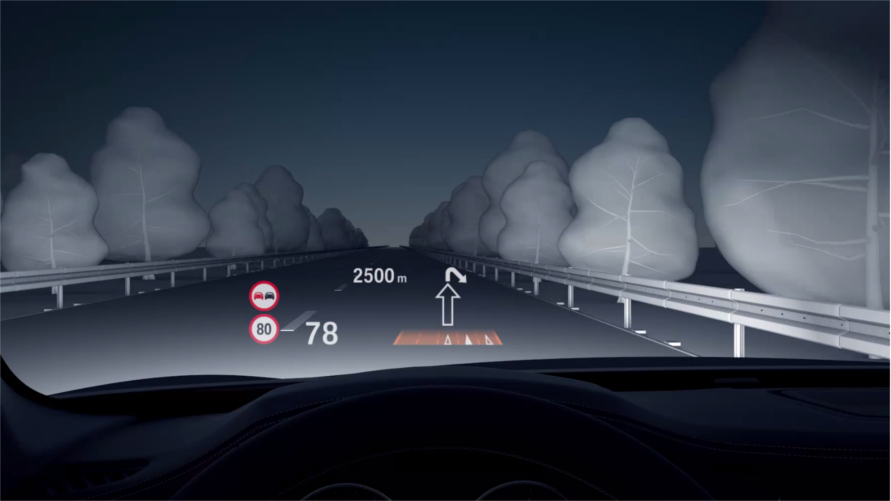 تُعرض الأيقونات الظاهرة على الزجاج الأمامي بدقة كبيرة وألوان فائقة الوضوح، حيث يظهر عرض الصور كما لو كانت على بعد 2.3 متر أمام السيارة. وبهذا يمكن ضمان عرض المعلومات وقراءتها بسرعة وراحة دون أي تشتت لانتباه السائق، بالإضافة إلى ميزة عرضها في موقع مثالي يتناسب مع مكان السائق.