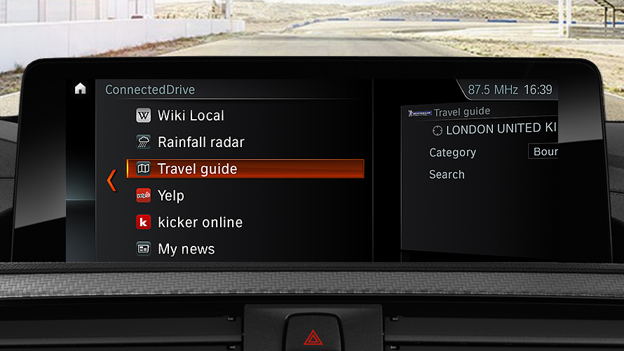 تتضمن تلك الوظائف كلاً من خدمة BMW Online والتي تقدم معلومات مفصّلة عن الموقع الحالي كالأخبار وحالة الطقس ومحرّك بحث إلكتروني من Google™ وعدداً من الوظائف المكتبية. و من خلال قائمة التطبيقات، يمكنك جمع نخبة من الخدمات ذات الطابع الفردي مثل كاميرات الويب ومعلومات عن أسعار الوقود ومواقف السيارات ودليل السفر والفنادق.