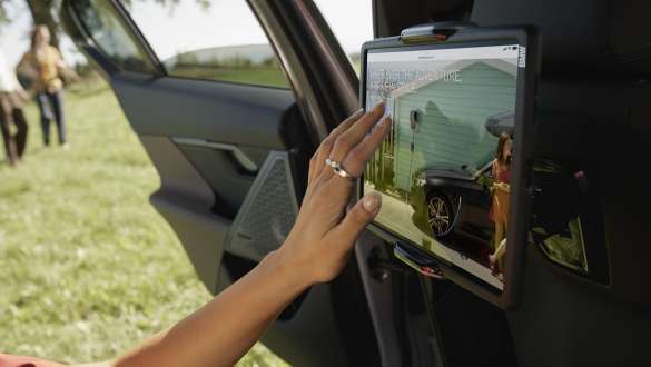 حامل آمن للأجهزة اللوحية مع حقيبة السلامة من BMW (بالغلاف الواقي). يتم توصيل الحامل، الذي يمكن ضبطه وفقاً لمواضع وزوايا الرؤية المختلفة، بالتجهيزات الاختيارية «السفر والراحة» أو بالحامل القياسي.