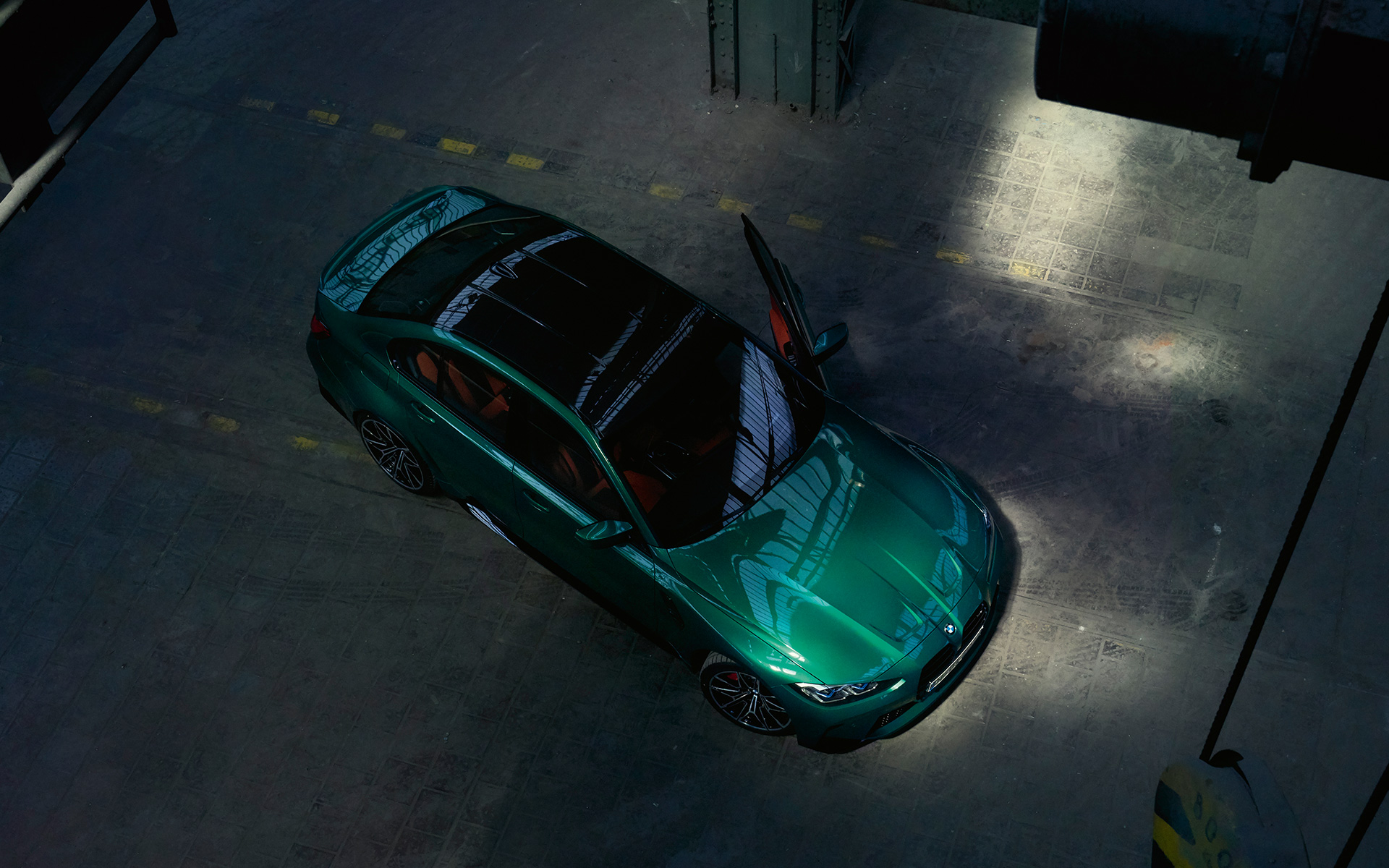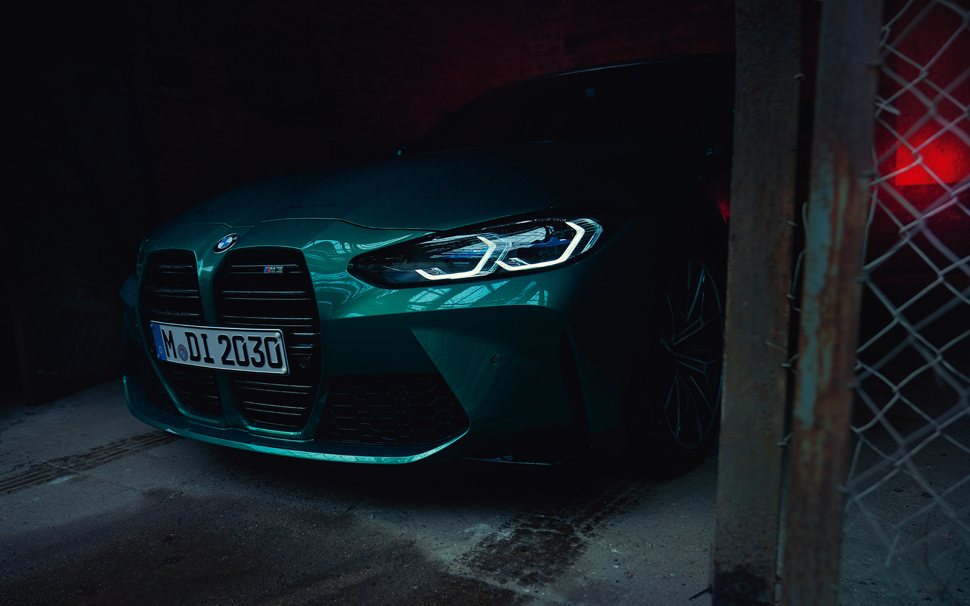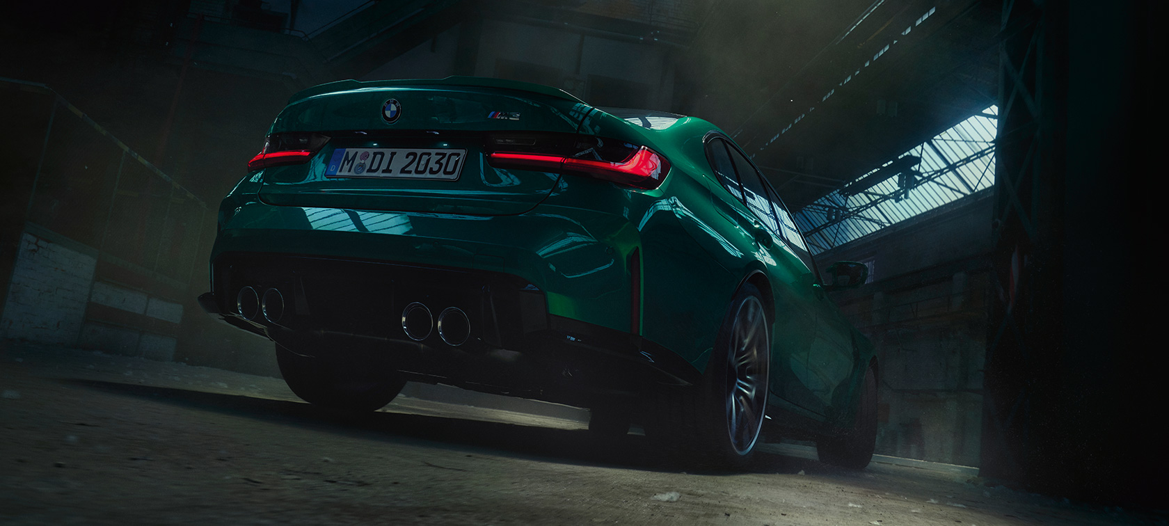 Exterior view of the BMW M3 Sedan in Frozen Deep Green