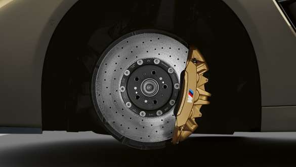 The M Carbon ceramic brake delivers braking power even more directly. The brake is non-corrosive and tolerates even more heat. It impresses with extremely minimal wear and contributes to a lower vehicle weight, which has a positive impact on agility, dynamics and acceleration. The special technical equipment is visible through calipers in the colour Gold matt with M logo on the outside. Due to specific material properties, increased operating noise may occur during braking, e.g. in case of prolonged, low load or in wet conditions shortly before vehicle standstill. This design-related noise generation can be avoided by braking the brake dry in case of wetness or loading the brake more heavily after a long low braking load. The influence of wetness and road salt, e.g. after using car washes, dew overnight, driving in the rain, etc., the braking effect can correspond to that of a conventional braking system. This reduced braking power can be compensated for with a greater pressure on the pedal. The functional noises have no influence on the performance, operational safety and stability of the brake.