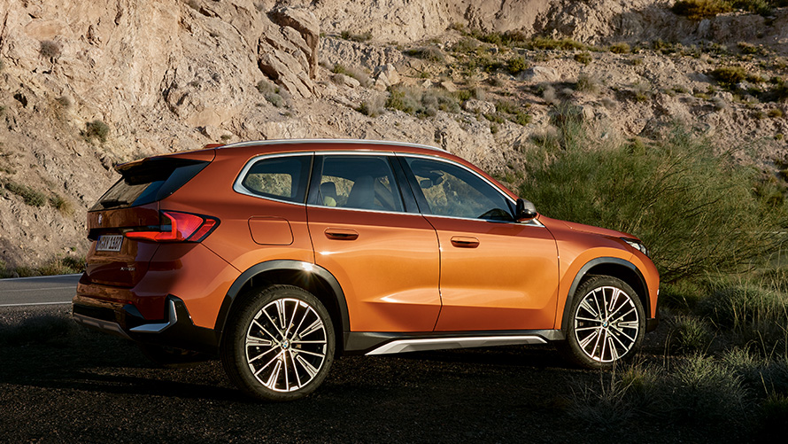 Light meets shadow. Large, almost square wheel arches. A prominent height on the road. From the side, the BMW X1 looks both rugged and refined.