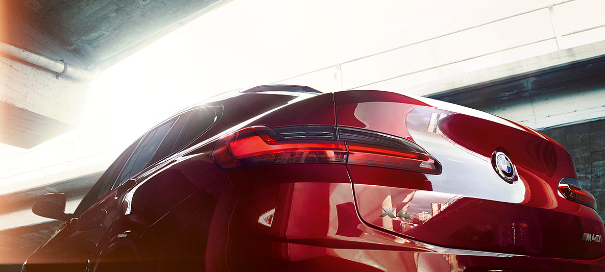 The expressive rear rounds off the overall dynamic impression of the BMW X4. Emphasising the sporting character of the vehicle are the slim rear window and the extremely low-slung roof spoiler. The roof line drops down to the tailgate with its trailing edge that forms the especially dynamic rear end.