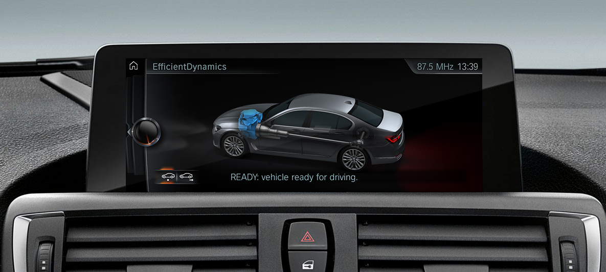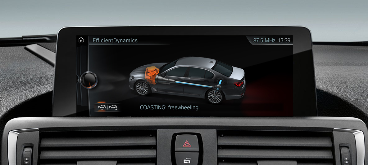 The energy-flow gauge in the Control Display clearly visualises the BMW EfficientDynamics technologies such as coasting, recuperation and the intelligent Automatic Start/Stop function.