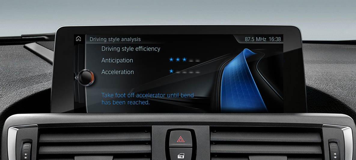 The driving style analysis function helps by providing tips based on the specific situation for developing a more efficient driving style and saving fuel. During the process, driving style is analysed and evaluated in various categories. The evaluation and accompanying tips are shown in the Control Display in the ECO PRO driving mode.