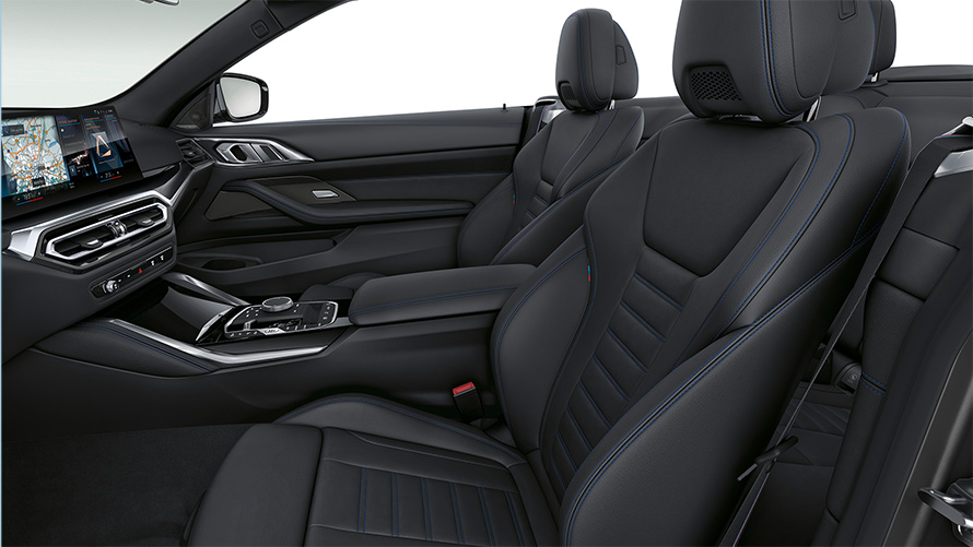 The BMW M4 Competition Convertible with M xDrive inspires with an impressive balance of aesthetics, charisma and high performance. Exclusive equipment options from BMW Individual allow you to additionally underline the unique character of this powerful convertible. You can choose between numerous brilliant BMW Individual paint finishes, such as the Imola Red illustrated here that creates such a spirited appearance. Or you can opt for the similarly expressive matt BMW Individual metallic paint finishes, such as Frozen Brilliant White, Frozen Portimao Blue, Frozen Orange, Frozen Dark Grey and Frozen Black. In the interior, M Carbon Sport bucket seats in finest ‘Merino’ leather define the sporty and elegant ambience. Among the choices available are the BMW Individual full leather upholstery options in 'Merino' Fiona Red/Black, Fjord Blue/Black and Ivory White and Tartufo – each with partial perforation. Completing the excellent overall impression are high-quality BMW Individual ‘Carbon Fibre’ interior trim strips with a highlight trim finisher in Pearl Chrome, fine-wood trim ‘Fineline’ Black with open-pore Silver effect or piano finish Black.